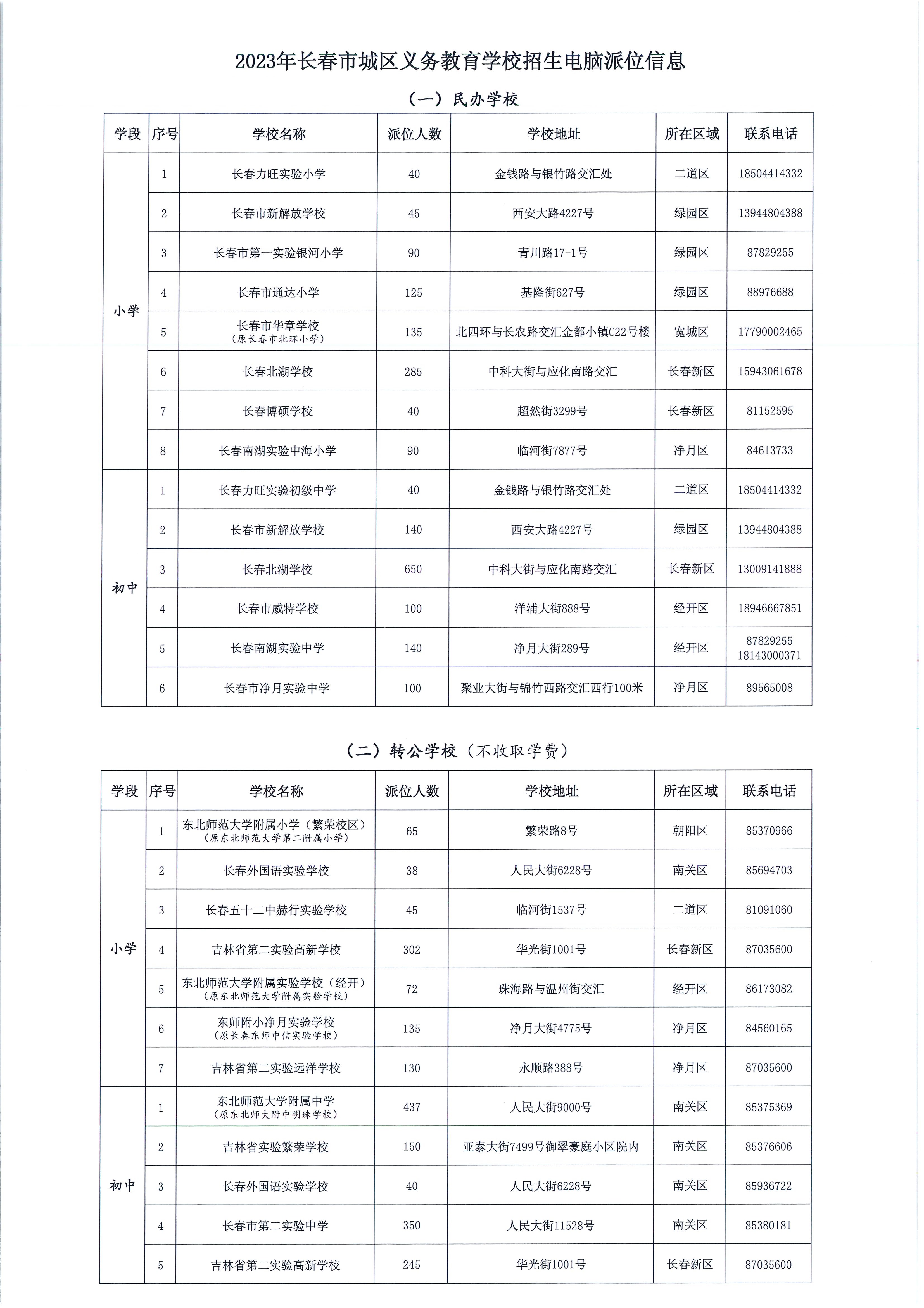 按照《长春市2023年义务教育招生入学工作实施方案》要求,经相关城区、开发区教育行政部门审核确认,现发布2023年长春市城区民办及转公义务教育学校面向全市招生的电脑派位信息。